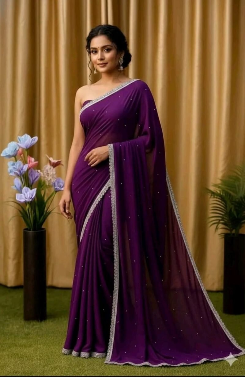 ইন্ডিয়ান জর্জেট এমব্রয়ডারি শাড়ি + ব্লাউজ পিছ (বেগুনী) S-38